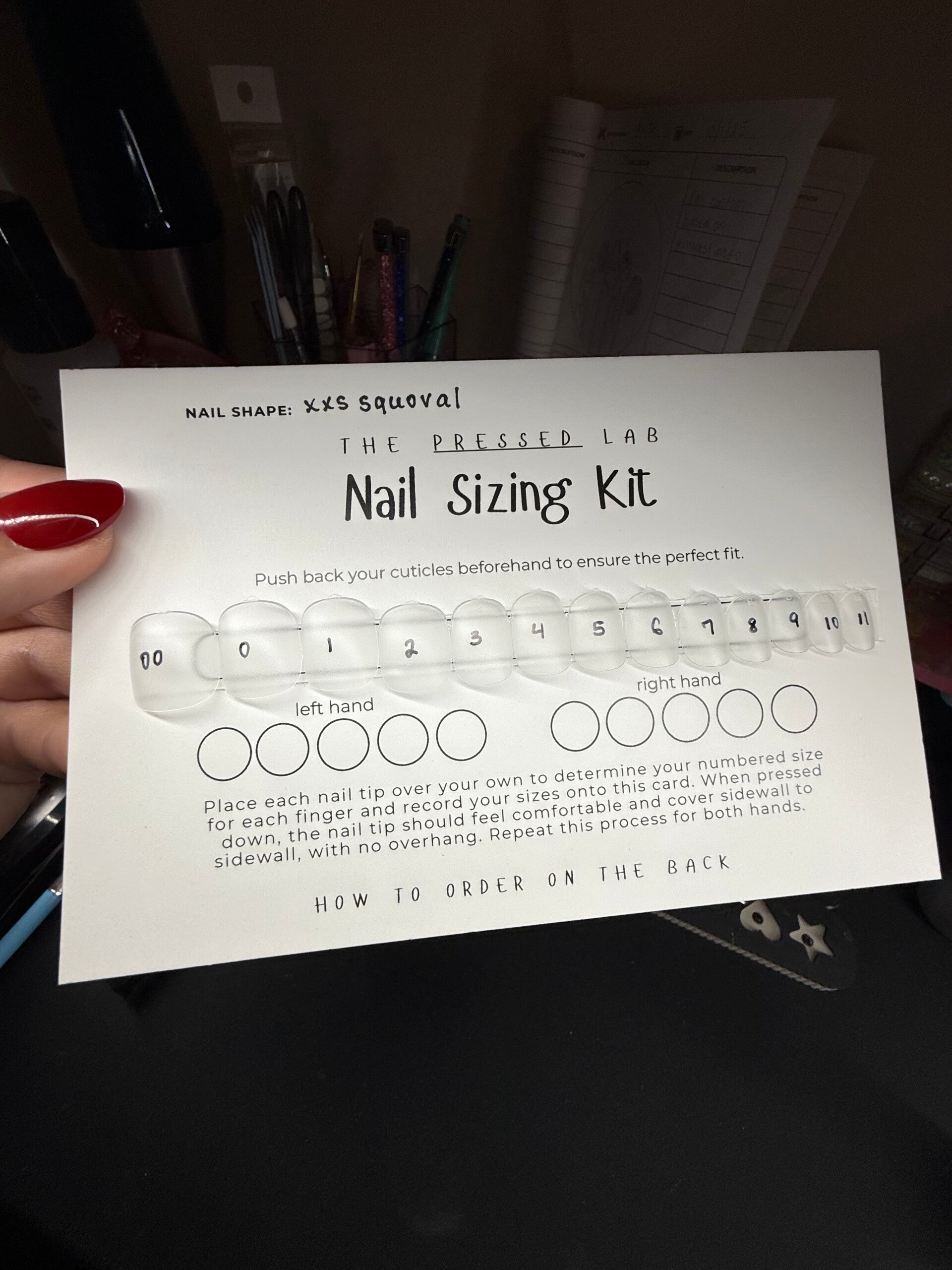 There's a desginated area on your sizing card for you to record your numbered sizes for each hand, and you'll input these numbers when you go to order your first set.